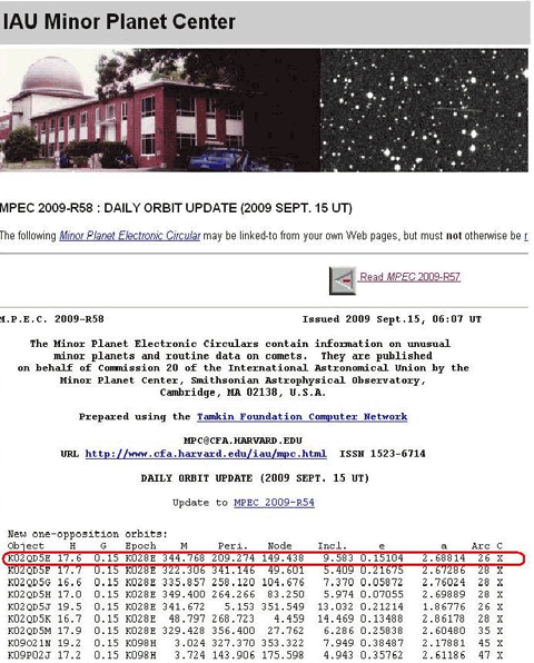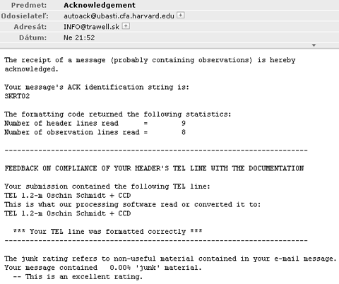 Usualy you receivewer about your observation from MPC in 24 hours . When it is a really new and uncatalogized asteroid, you will receive a message called "Designation", where privisional nuumber of your discovery is stated. The e-mail in our example shows that for object I sent to MPC as KRT118 was named as K02QD5E (short version), or as 2002 QE135 in other form.