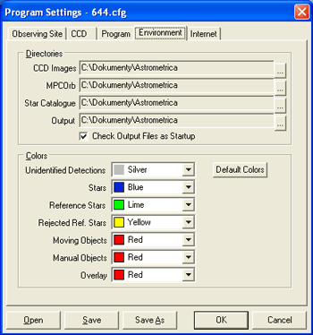 You have to adjust some data in Enviroment section too. Specify the route in your PC where you store the Astrometrica programm, in order that Astrometrica can find the way to needed data during work. Save ycorrected config file and use it in this form.