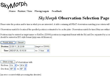 You can choose from 2 ways how to select images from SkyMorpharchive - either by coordinates of specific part of sky you wish to search by (Position/Time), or by specific minor planet or comet (Moving Target).