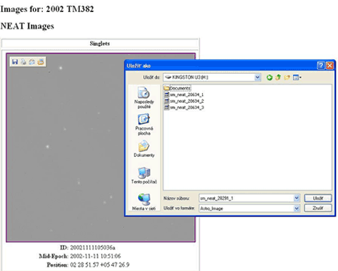In a while you will see requested images on your PC monitor. Bigger pictures means longer time for dowloading. Now you download images by "Save as ..." Images are so called Astro Image type, their endings is "fits". Your computer save them in this format, unless you have different type of files in your setup for saving.