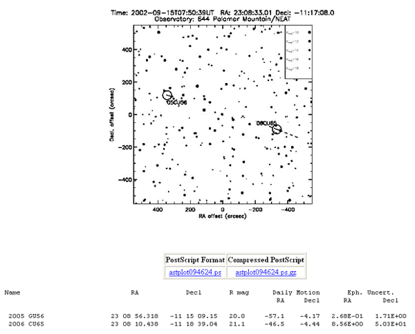 From newly received list choose another triplet for reviewing as close to the first date as possible. It does not depend whether selected images are after efore it. Choose the nearest one. Search among images from Palomar observatory (644) and of course keep your eyes also on the predicted brightness of the object. Select your triplet. In our example there are shown two triplets - 6 images from 2002 Aug. 29, from the same date, but different star fields. You have to select images from the same triplet! You learn out which three is from the same one by columns Observation Center. Here are stated coordinates of images centres, do not slip those with computed coordinates of searching object! I marked the triplet with blue circles.