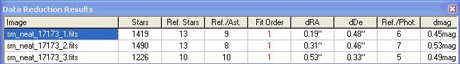In second menu row Astronomy click on Data Reduction, or simply use the shortcut by CTRL+A and then you will see a new window for coordinates input (RA a Dec) of searched CCD images. In the list you will find these in rows Predicted Object Position. You fill in both coordinates and click OK. Astrometrica checks now reference stars. In cyou filled wrong data, Astrometrica could not find correct reference stars, so it matches them incorrectly. After this step in table Data Reductions Results look at Fit order.