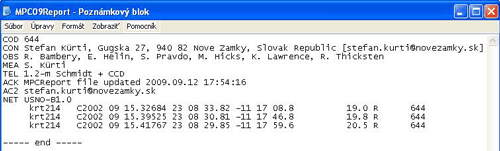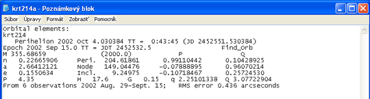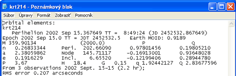 It this part of your work you need to determine orbital elements of your object. I recommend for this purpose Find Orb. This programm compute orbital elements based on your measurements in Astrometrica. Open the programm, click on Open and upload your MPCReport.txt. It shows you all your data. In our example there you see positions of krt214.