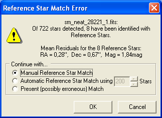 You need Fit Order = 3! Sometimes coordinates are shifted and Astrometrica could not find reference stars. In such a case a table Reference Star Match Error will occur. You can solve this in 3 ways. When you use first - Manual Reference Star Match, you can move reference stars by your own in a correct direction and match stars on your images with reference stars mechanically. But before you do this, I recommend to take second choice first - Automatic Reference Star Match using. And only after that would not help, then try to match stars manualy. To accept the third possibilty means to accept erroneus match, which I do not recommend at all. You will have wrong reference stars and so your measurements are wrong too ...