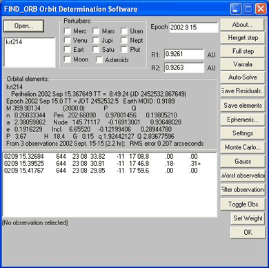 Now click on krt214 and all positions shows in a window below. As your positions cover just a very short observational arc 30-60 minutes, to receive preliminary orbit you have to use Vaisala method of determination. Click on Vaisala button and you will get the preliminary orbit. Save the computation result with the same name as you named your object - e.g. krt214.txt - by clicking on Save elements.