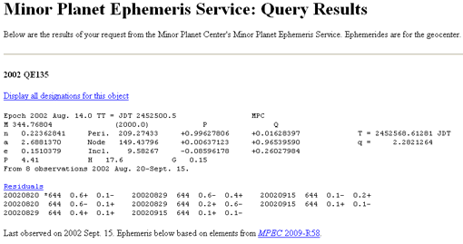 Now click on Get ephemeris/HTML and you will see soon orbital elements of your discovery together with all observations listed in MPC of this minor planet. This way you can follow your discovery from very first positions as far as it will be numbered and even beyond.