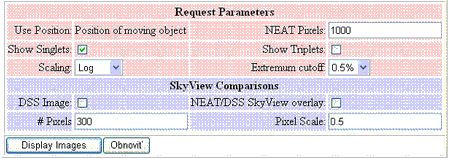 Now you check in left column images you wish to search. In the table Request parameters you choose the size of returned images in NEAT pixels box. I recommend size around 1000 pixels. Check in also a box of Show singlets, other parameters leave bland submit it by Display images.