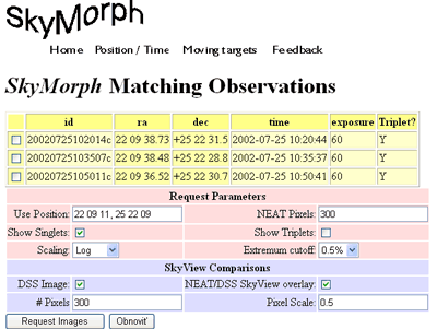 In the first choice SkyMorph returns all images according to selected coordinates Ra, Dec and time. This search works also in case you choose only one of them - position or date and time. Time interval is really broad - from 1 second to 1 year. On the picture bellow you can see the result of search for selected coordinates and date in 1 hour scale. It returned only 1 triplet of images. When you are searching for images of specific area of sky or specific dates you should use this tool.