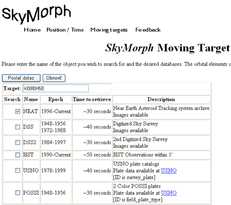 When you choose recently discovered asteroid for the search, write its designation into empty window Target. In my example for this article I choosed minor planet 2009 BE175 (in short vesion as K09BH5E). Then in Search column you check from available databases only NEAT database and submit it.
