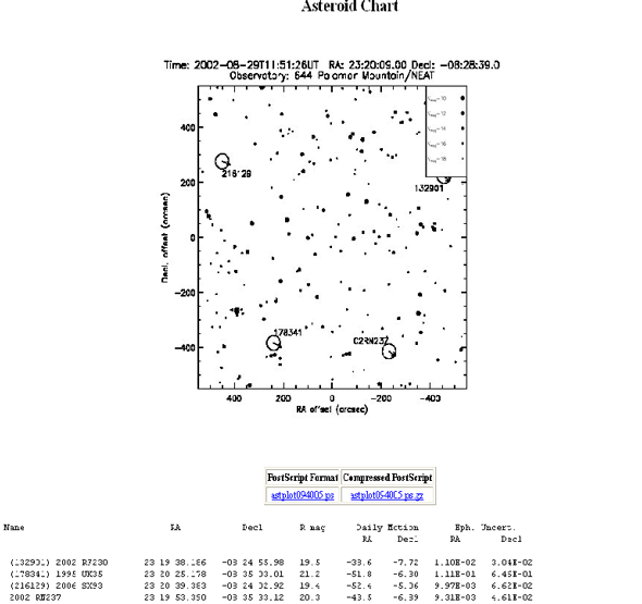 In next step you have to find out whether your discovery belongs to known or unknown objects. For this I use ASTPLOT, the on-line service of Lowell Observatory. When you enter coordinates of your object from MPCReport, ASTPLOT draws a plot of specified starry field with positions of all known asteroids and comet within specified area. When there is minor planet in the middle of the chart, that means you measured positions of already known asteroid. Otherwise (when nothing showed up in the centre) you probably found something new!