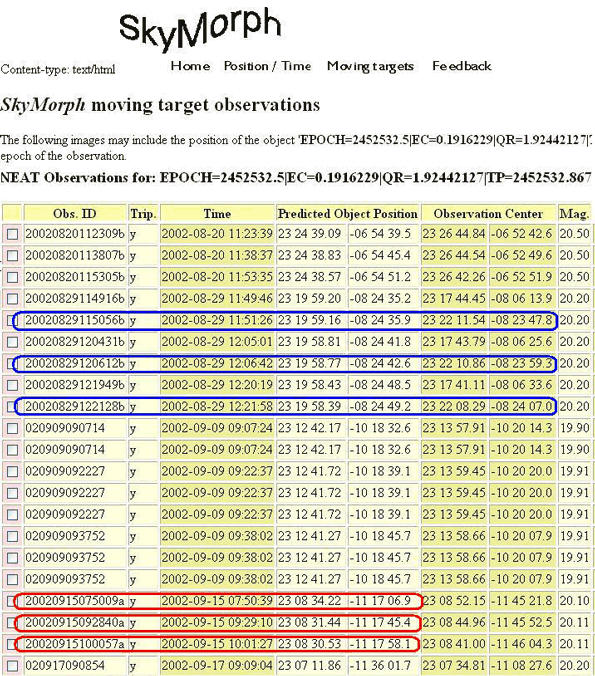 Be careful with sign in front of decimal numbers - it is dot, not a comma! When you input all data submit them. SkyMorph returns a new list. Now you can check whether your present step was correct. When on this list is also your "discovery" triplet, it verifies and proves that you are on good track. In our example it is OK. Images from 2002 Sept. 15 are on the list! I marked them with red circles in the picture. But you should check also exposures times too - they should be the same too! In other case, you are on the wrong way ...